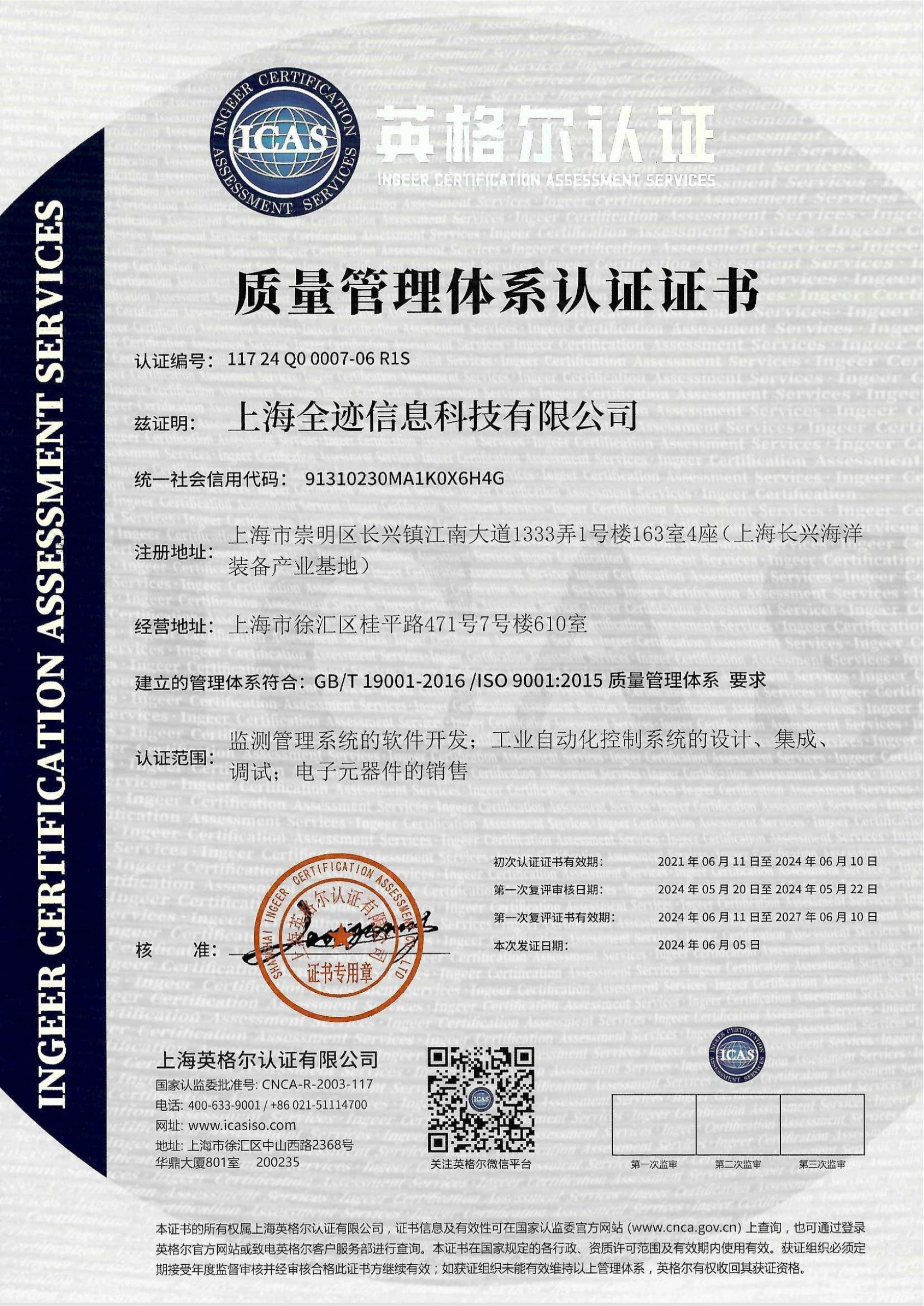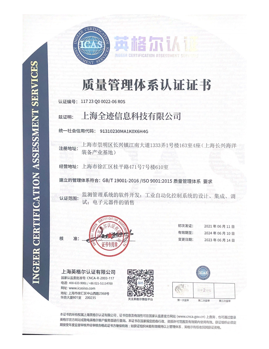 上海全迹信息科技有限公司是一家创立于2018年5月的上海市专精特新中小企业、上海市高新技术企业、上海市创新型中小企业、上海市科技型中小企业,创始人由国内自动化和软件行业头部企业的优秀人才组建而成。公司致力于为国家重点行业和重点企业的信息化、数字化和智能化建设提供含软硬件的一体化解决方案,为重点企业数智化发展提供强大助力。公司具备ISO质量、环境和职业健康体系认证证书,同时公司拥有多项具有自主知识产权的软件类产品。公司在所涉足行业具有丰富的行业应用软件研发和控制系统系统集成经验和业绩。